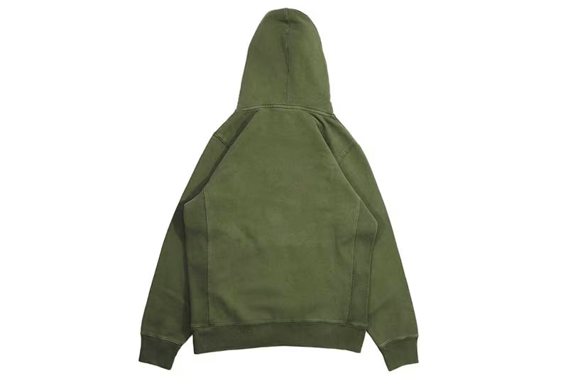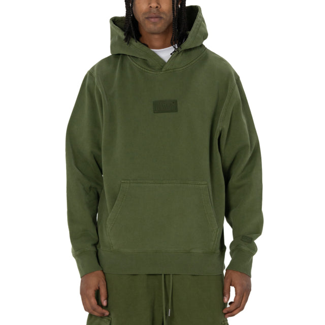 ヴィンテージウォッシュ加工を施したプルオーバーフーディー。カンガルーポケット。フロント・スリーブにシリコンボックスロゴパッチ。